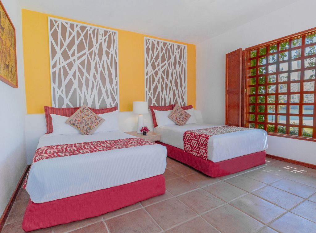 Con una cama king y una cama queen, esta suite de 73 m² es ideal para familias pequeñas que buscan amplitud y estilo sin perder la vista al mar.